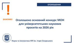 Міністерство освіти і науки України своїм наказом від 16.09.2025 №1253 17 вересня 2025 року оголосило конкурсний відбір проєктів фундаментальних наукових досліджень, прикладних наукових досліджень та науково-технічних (експериментальних) розробок молодих учених, які працюють (навчаються) у закладах вищої освіти, що належать до сфери управління МОН, виконання яких розпочнеться з 2026 року за рахунок…